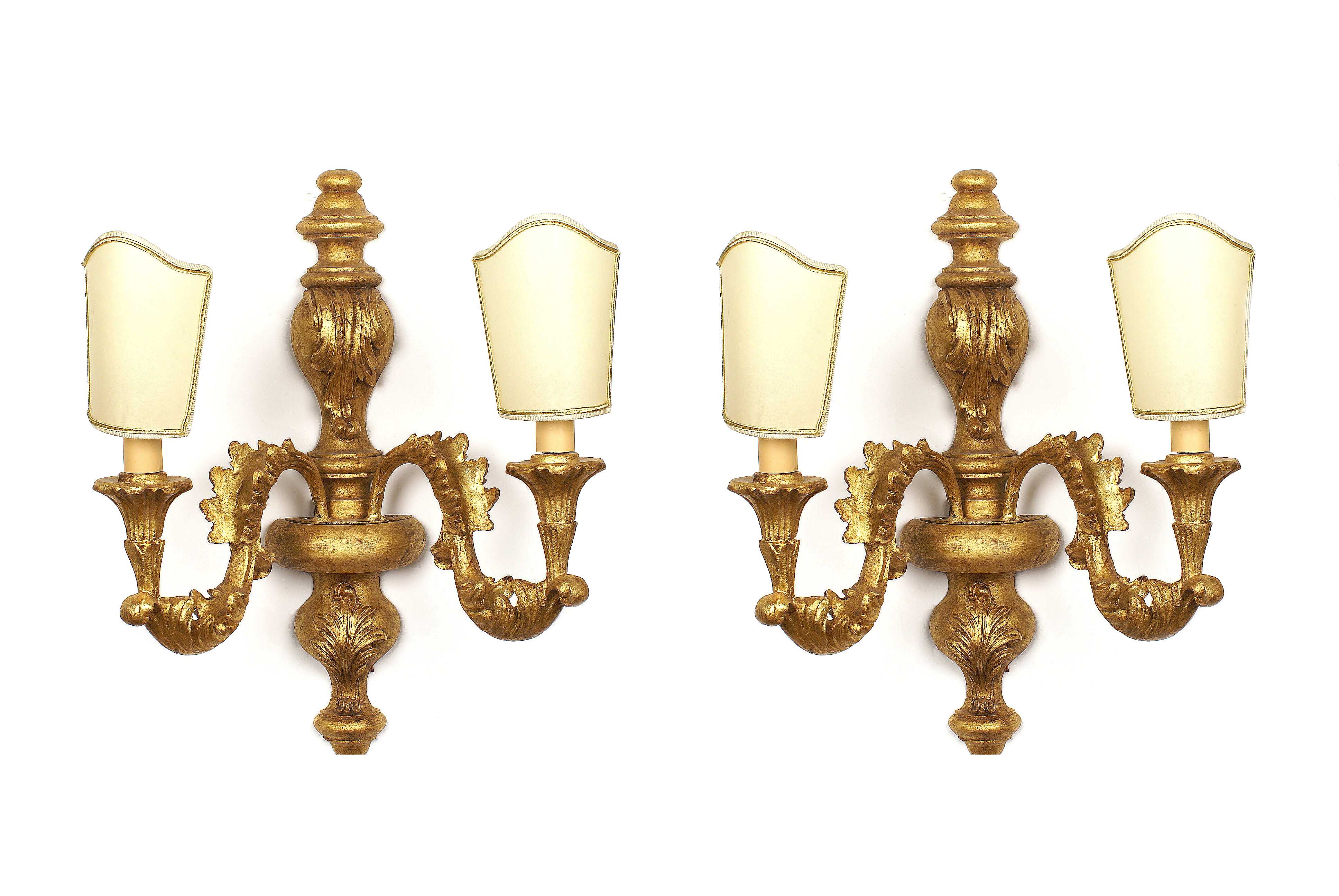 COPPIA DI APPLIQUES A DUE LUCI In legno dorato, complete di ventoline Dim. 46x40 cm.