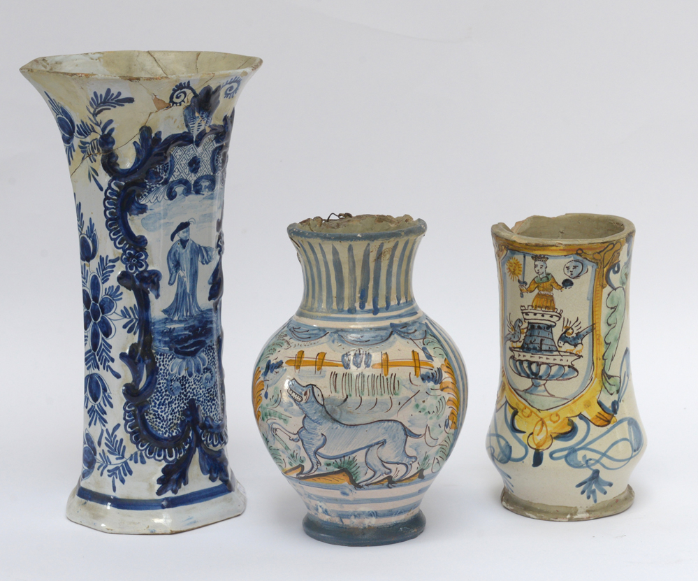 Lotto 2632 | Lotto di tre antichi vasi in maiolica di diversa manifattura e decoro (difetti,