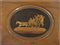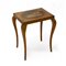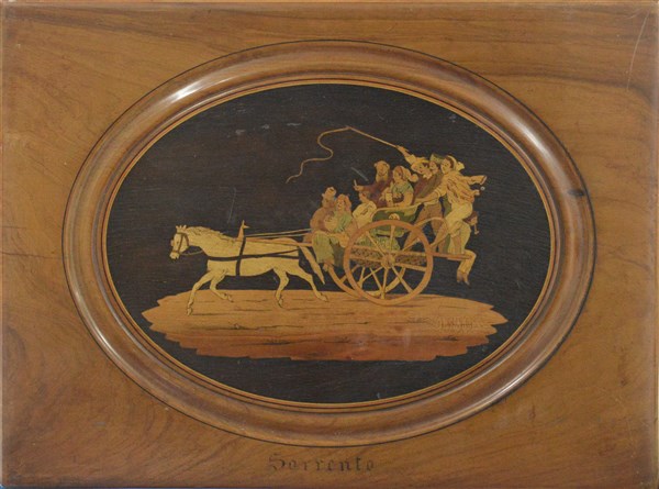 Tavolino basso con piano intarsiato con figure su un carro