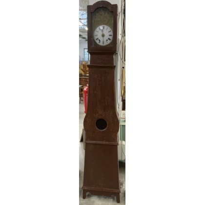 Orologio a torre del tipo morbier in legno con quadrante in bronzo dorato a cifre romane. Movimento a due treni con suoneria su campanello. Quadrante in smalto bianco con numeri romani , mostra in rame sbalzato. Misure cm 48x 243,5x20 circa. (gravi difetti)