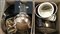 Lotto composto da quattro cartoni contenenti oggetti di varie forme e uso in metallo argentato (difetti)