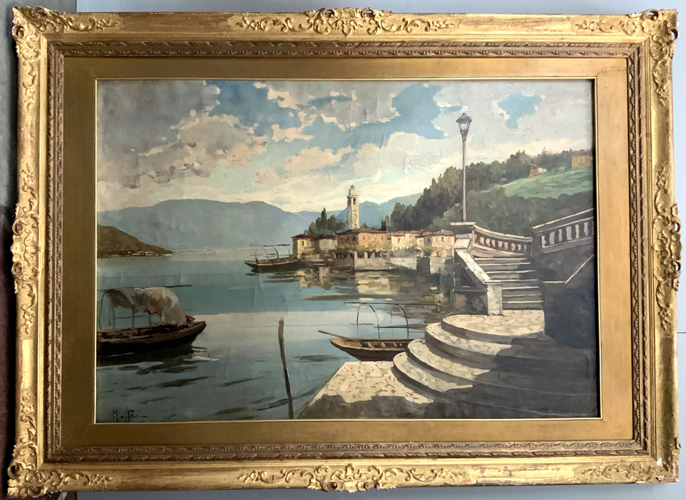 "Scorcio lacustre con barche" olio su tela (cm 67x98) firmato in basso a sinistra, in cornice dorata (lievi difetti)