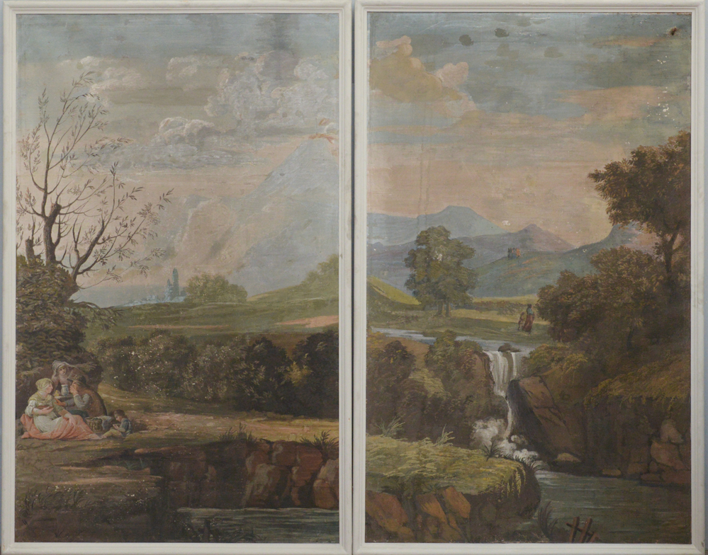 Scuola del secolo XIX "Paesaggio con cascata e figure" e "Figure in un paesaggio" coppia di dipinti, tecnica mista su tela (cm 170x105) In cornice (difetti e restauri)