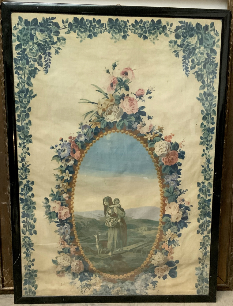 Pannello decorativo raffigurante contadina con bambino in un paesaggio in cornice floreale (cm 130x92) (difetti)