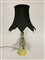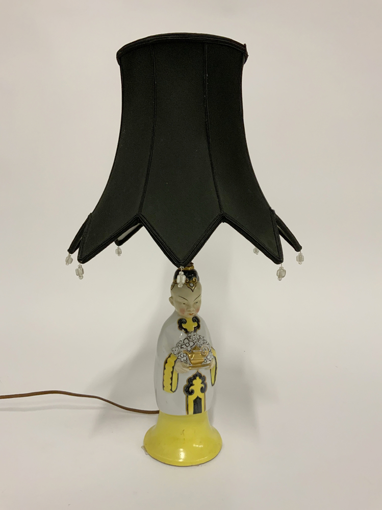 Lampada da tavolo. Manifattura Goebel, Germania, 1925/1935. Fusto a tutto tondo in porcellana policroma nei toni del bianco giallo nero e oro che raffigura un cinesino che regge una teiera; paralume in seta nera e montatura originale. Marcata con simbolo grafico in blu sotto la base al centro, simbolo grafico impresso sul bordo sotto la base. (h fusto in porcellana cm 26)
