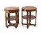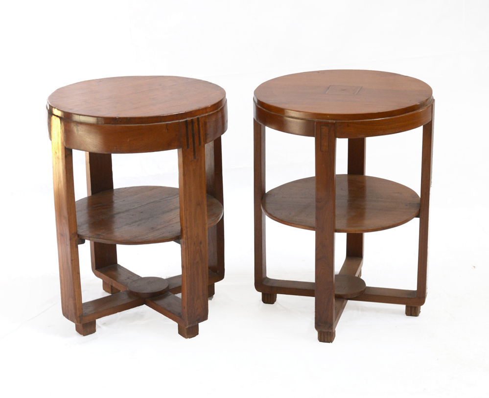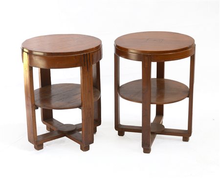 Lotto di due comodini déco con piano tondo on legno massello di noce con intarsi in legni diversi sulla parte sommitale delle gambe. Italia, anni '30. (h cm 60; d cm 46) (lievi difetti e restauri)