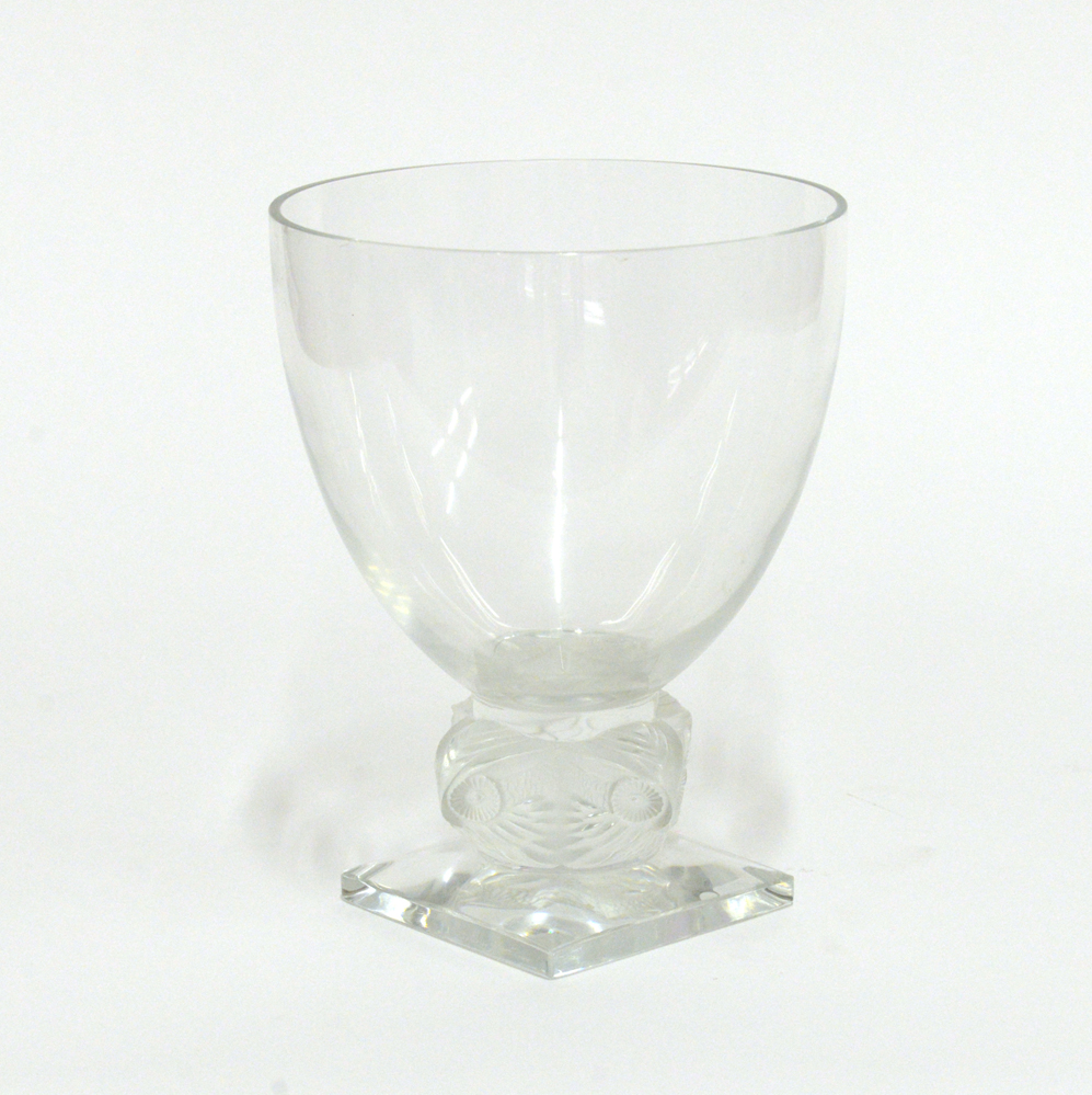 Coppa in vetro soffiato a stampo incolore con manico in vetro acidato sulla superficie esterna e decorato con volatili. Francia, secolo XX. (h cm 24,5; d cm 19) (lievi difetti)