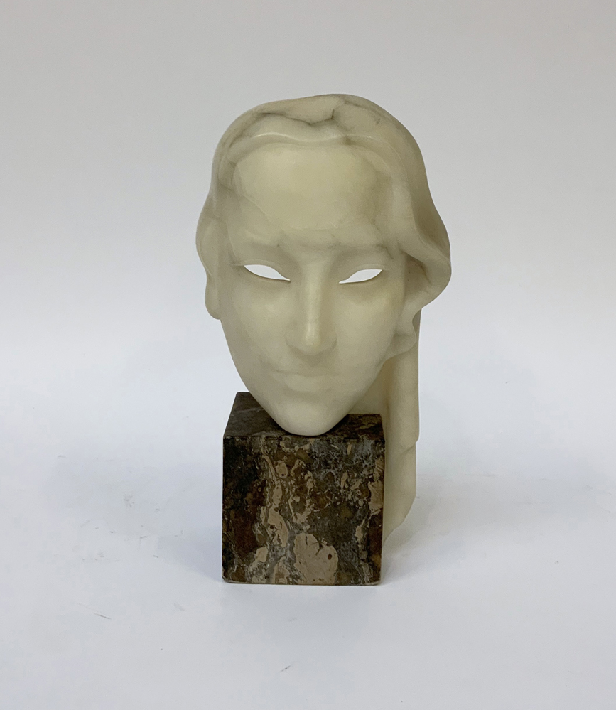 Scultura in alabastro raffigurante una maschera femminile montata su un piccolo basamento in marmo scuro. Itallia, anni '20/'30. (h cm 28) (lievi difetti)