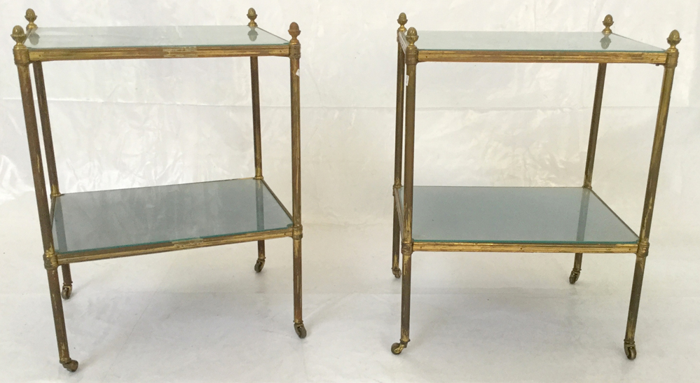 Coppia di piccole etagere a due ripiani rivestiti in velluto azzuro e vetro con montanti in ottone terminanti a pigna. Italia, anni '40. (cm 43x59x33) (difetti)