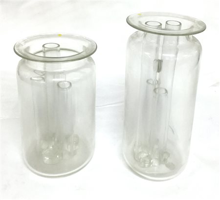 Lotto di due vasi portafioni in vetro trasparente incolore. Secolo XX. (h cm 31