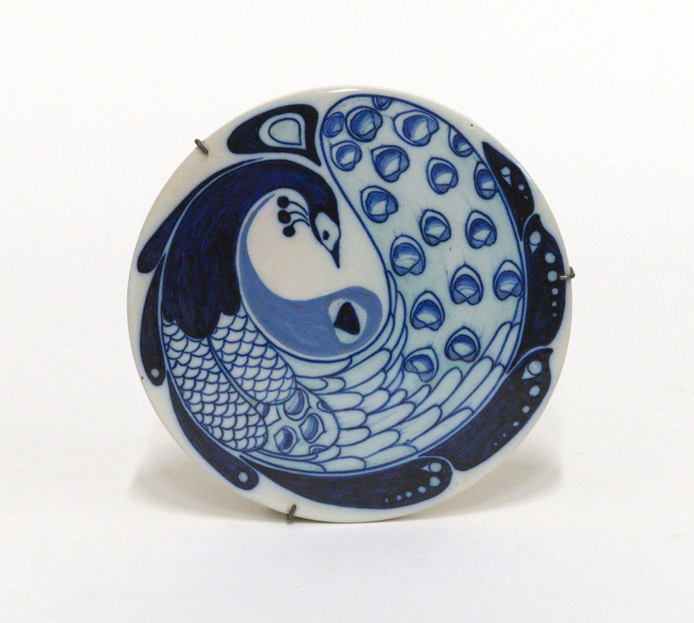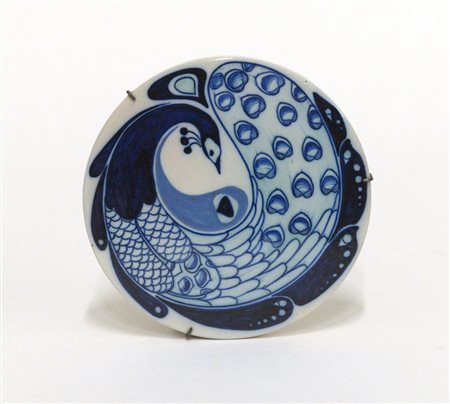 Tondo in ceramica smaltata in bianco e blu con figurazione di pavone. Firenze, prima metà secolo XX. Firmata al verso con simbolo grafico della molograna. (d cm 16) (lievi difetti)