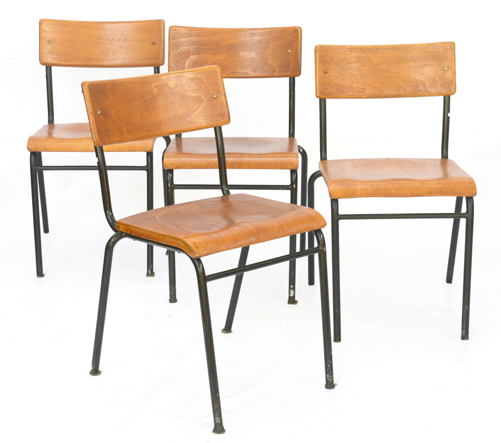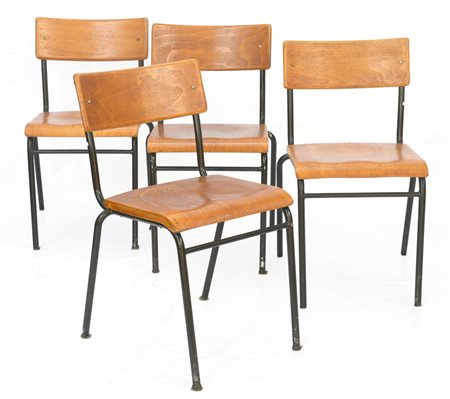 Gruppo di quattro sedie con struttura tubo metallico cromato riverniciato in nero, seduta e schienale in legno multistrato. Italia, anni '40/'50. (cm 42x79x45) (lievi difetti e restauri)