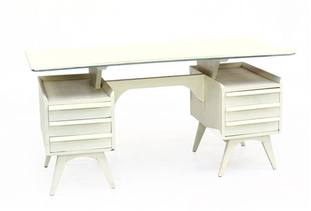 Scrivania in legno impiallacciato e verniciato bianco a sei cassetti. Italia, anni '50. (cm 160x79x69) (difetti)