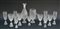 Parte di set di bicchieri composto da una brocca con manico, una bottiglia con tappo, una caraffa, undici bicchieri da spumante, due coppe da champagne, quattro bicchierini da amaro, tre coppe da vino rosso e cinque coppe da vino bianco in vetro soffiato e parzialmente acidato sulla superficie esterna. Secolo XX. (Misure varie) (lievi difetti)