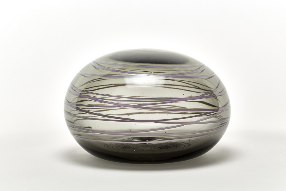 Scultura di forma sferica schiacciata in vetro ametista chiaro con fasce a spirale in vetro lattimo. Anni '70. Iscritta a punta sotto la base con dedica "A Franca with love - Gini". (h cm 15; d cm 24)