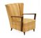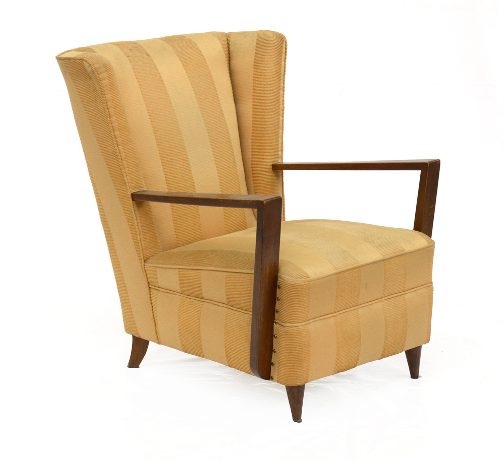 Poltrona con braccioli in legno e rivestimento in tessuto a righe gialle. Italia, anni '50. (cm 72x84,5x74) (difetti)