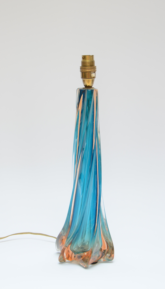 Lampada a costolature ritorte in vetro sommerso trasparente,azzurro e arancione. Anni '70. (h cm 41) (difetti)
