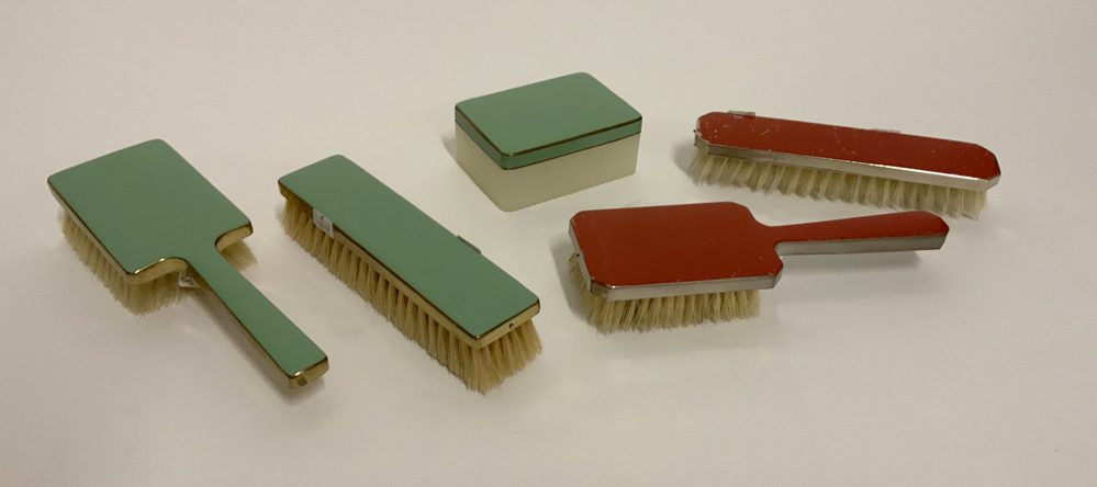 Lotto composto da due spazzole in smalto verde, due in smalto rosso e una scatolina portasapone in smalto verde e plastica. Germania, secolo XX. (misure diverse) (lievi difetti)