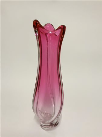 Vaso in vetro soffiato trasparente e ametista a tre grosse costolature. Belgio, anni '60. Firmato a punta sotto la base. (h cm 55)