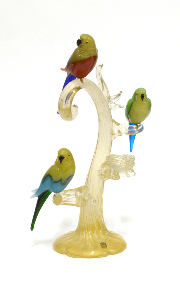 Manifattura di Murano "Pappagalli" Scultura in vetro massello sommerso traspare