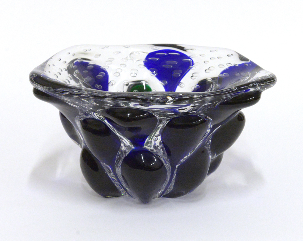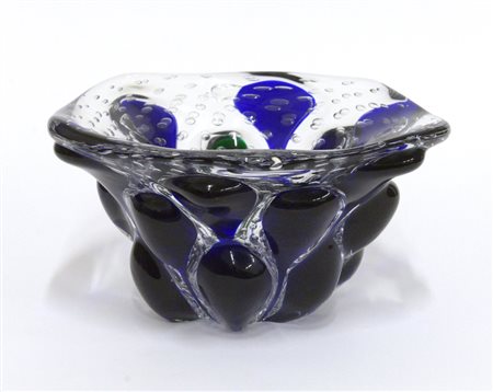 Grande ciotola in vetro massello e sommerso trasparente incolore e blu con inclusione di bolle. Murano, seconda metà secolo XX. Firmato a punta sotto la base. (h cm 18,5; d cm 34)