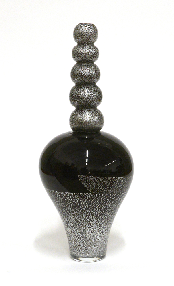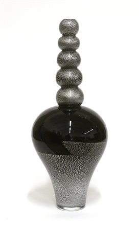 Portacandela in vetro sommerso ametista scuro con inclusione di foglia d'argento. Murano, esecuzione recente. Firmato a punta sotto la base "C.V.M. Murano". (h cm 45,5)