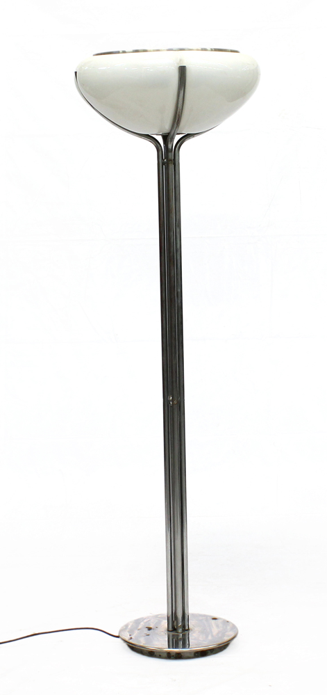 Lampada da terra modello "Quadrifoglio". Produzione Harvey Guzzini, 1974. Alluminio, metallo cromato, metacrilato bianco. (h cm 163,5) (difetti)