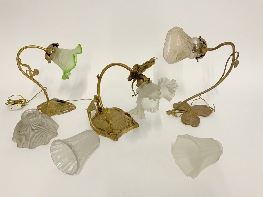 Lotto di tre appliques Art Nouveau in fusione metallica dorata con paralumi in vetro soffiato di manifatture diverse tra cui Loetz, unito a tre paralumi di epoca déco in vetro. 1900/1925ca. (misure diverse) (difetti)