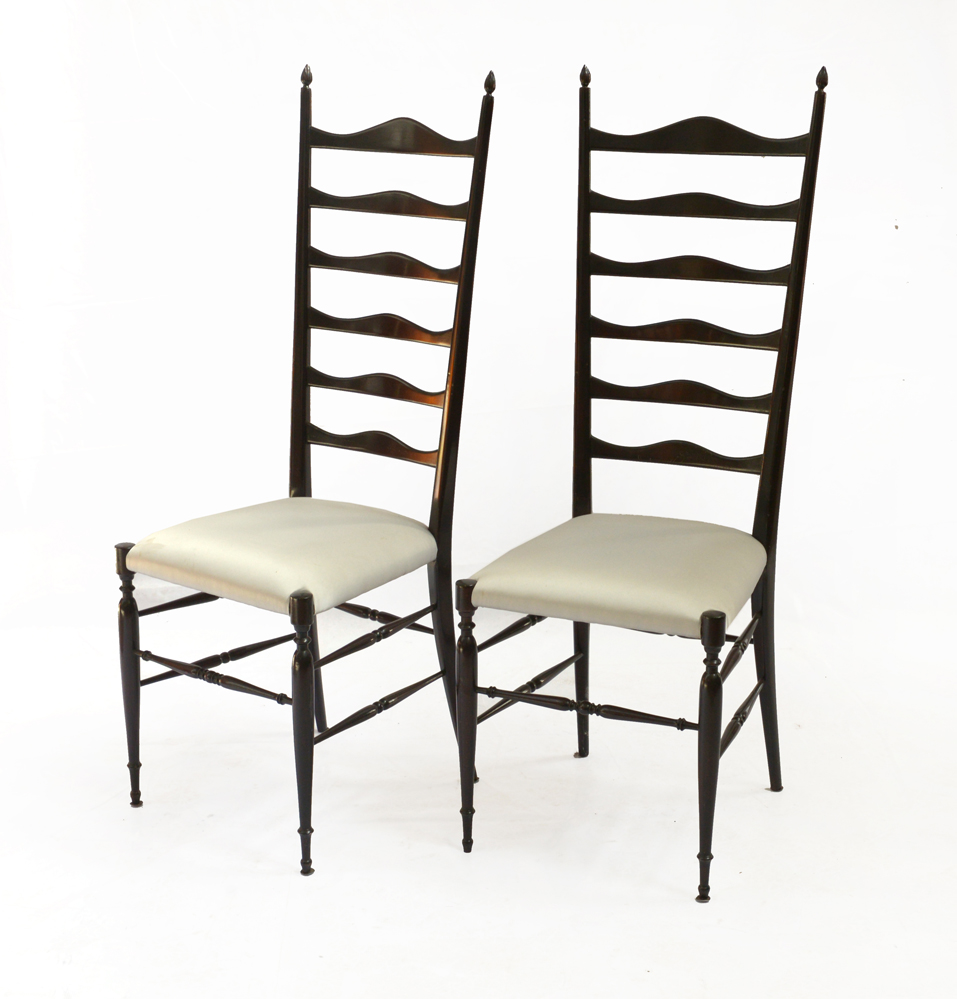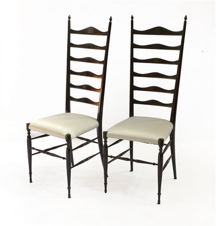 Coppia di sedie con schienale alto. Italia, anni '40. Legno di mogano e seduta