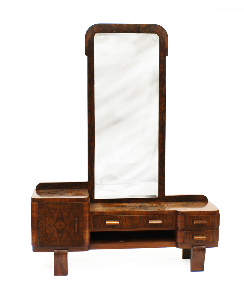 Mobile toilette in legno impiallacciato in radica con specchiera. Italia, anni '30/'40. (cm 129,5x174x36) (lievi difetti)
