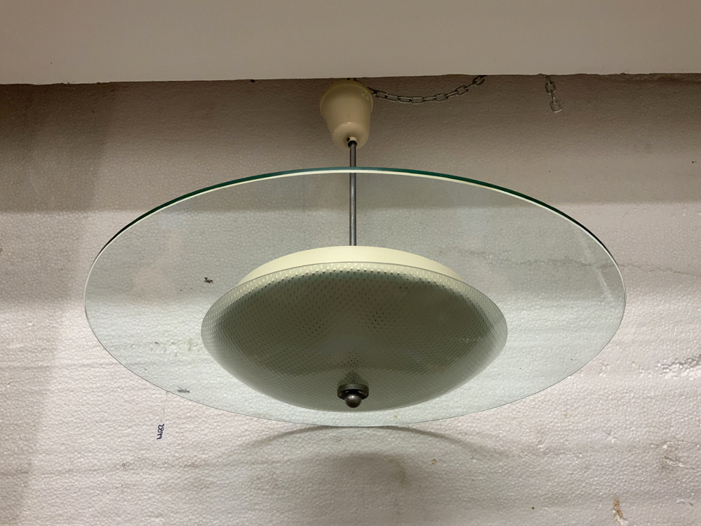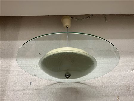 Lampada a sospensione con disco diffusore in cristallo molato e stampato, struttura in metallo. Italia, anni '50. (h cm 50; d cm 62) (lievi difetti)