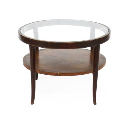 Tavolino da salotto con struttura in legno di mogano massello, ripiano intermedio impiallacciato, piedini rastremati e piano in cristallo molato. Italia, anni '50. (h cm 50,5; d cm 69) (lievi difetti)