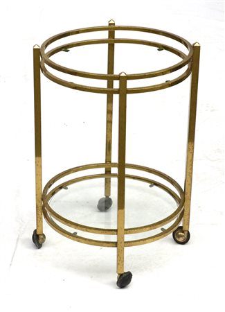 Carrellino circolare in ottone con ripiano inferiore in vetro. Italia, anni '70. (h cm 55; d cm 35) (lievi difetti e mancanze)