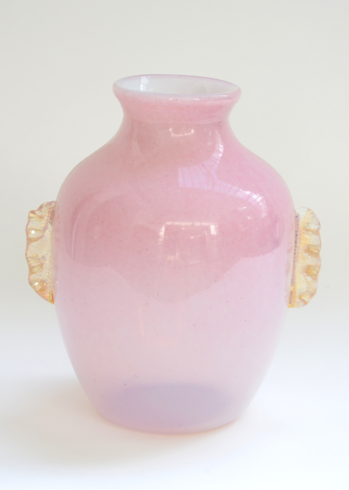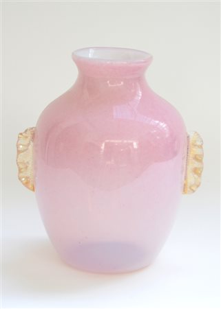 Vaso a morise in vetro soffiatto sommerso incolore lattimo e rosa con applicazione di foglia d'oro. Anni '80/'90. (h cm 30)