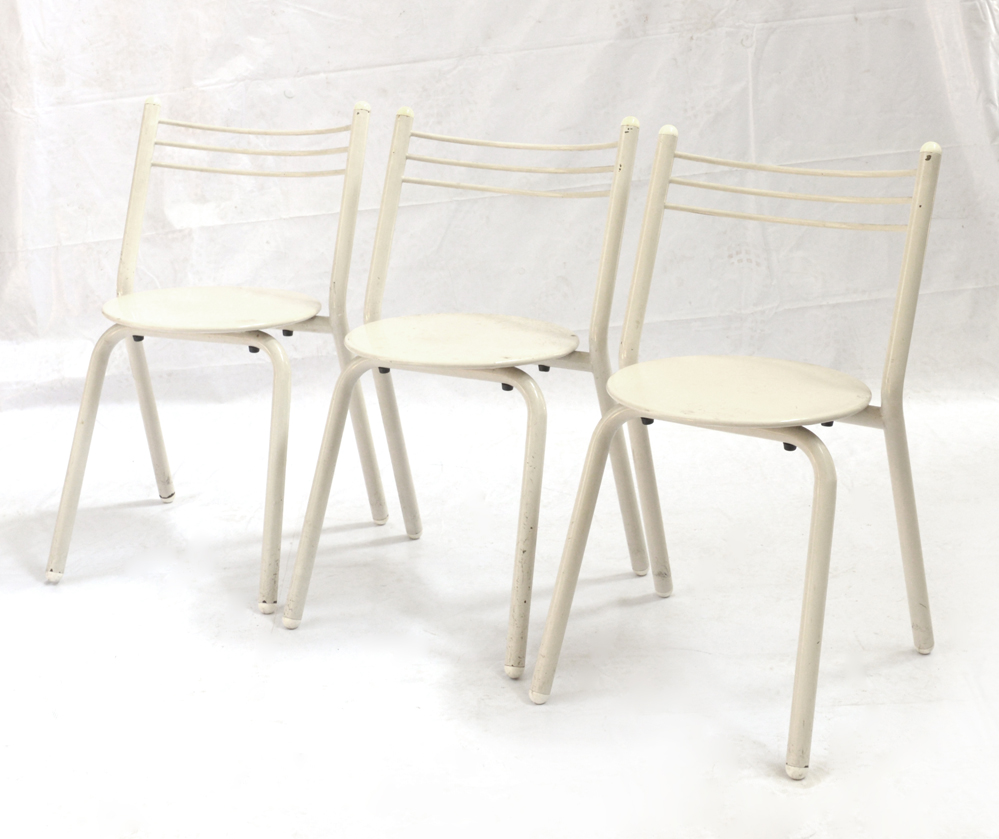 Lotto di tre sedie in accaio laccato bianco e plastica. Italia, anni '80. (cm 4