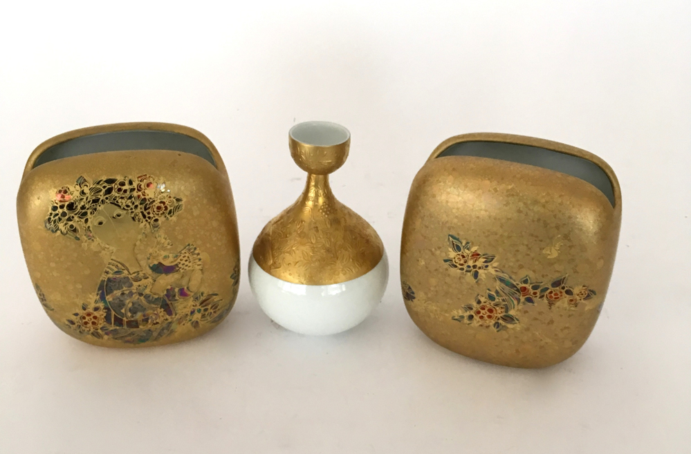Bjorn Wiinblad Lotto di tre vasetti in porcellana decorati a fondo oro e a rilie