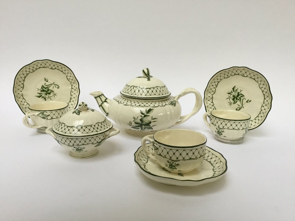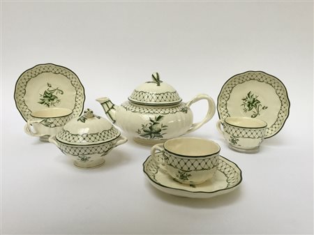 Servizio da tè in terraglia composto da teiera, lattiera, zuccheriera e dodici tazze con piattini con decoro monocromo in verde. Laveno, anni '20/'30. Marcato sotto la base con il simbolo grafico della manifattura. (difetti e mancanze)