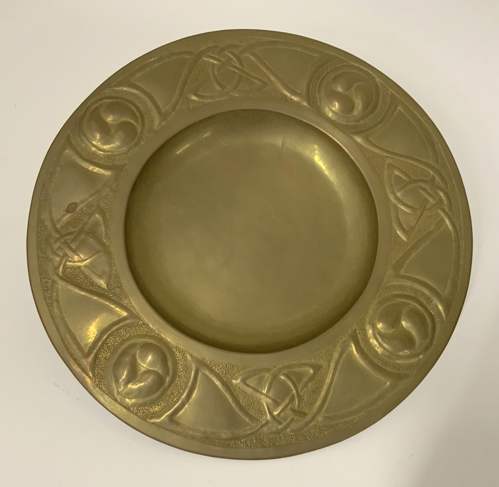 Manifattura belga Tondo da parata in ottone sbalzato a disegno Art Nouveau stil