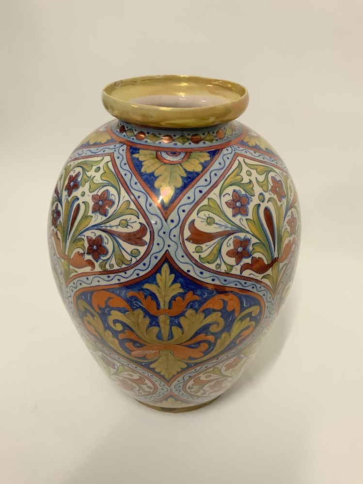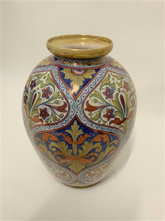 Vaso in ceramica smaltata sotto vetrina in policromia e a lustri metallici con decori vegetali. Prima metà secolo XX. Siglata sotto la base. (h cm 40) (difetti)