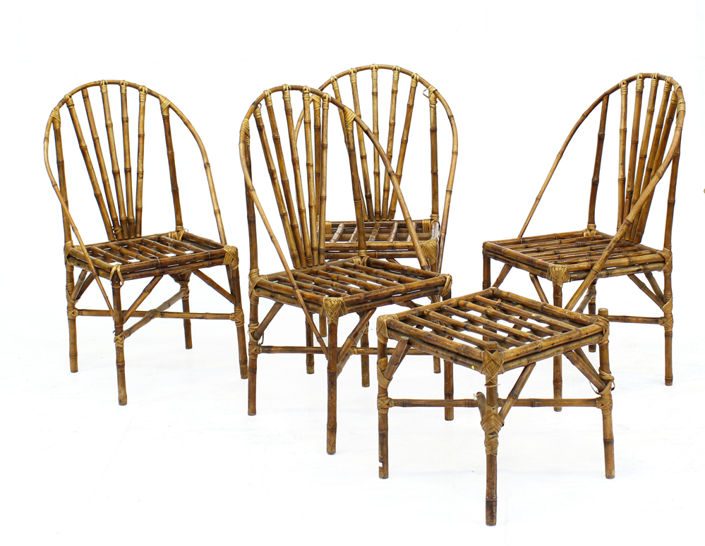 Lotto composto da quattro sedie e uno sgabello in giunco e malacca. Italia, ann