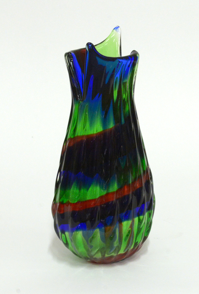 Formia Vaso in vetro massello a fasce policrome e corpo costolato. Murano, anni