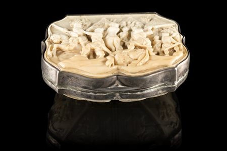 Antica tabacchiera in avorio scolpito con raffigurate scene di battaglia medioevale nella parte anteriore e trionfi d'armi nella parte posteriore, il tutto incassato in lastra e con cerniera d'argento.
