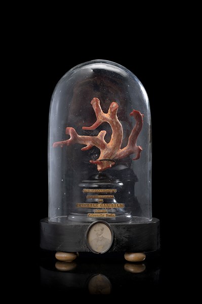 Teca contenente un ramo di corallo con iscrizione 'Corallo vergine pescato a Caprera dal generale Garibaldi. Dono del colonnello Nullo' e foto d'epoca del colonnello stesso.