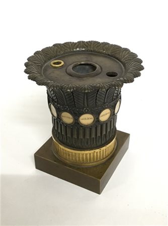 Calamaio in bronzo patinato e dorato al mercurio celebrativo dei grandi scritto