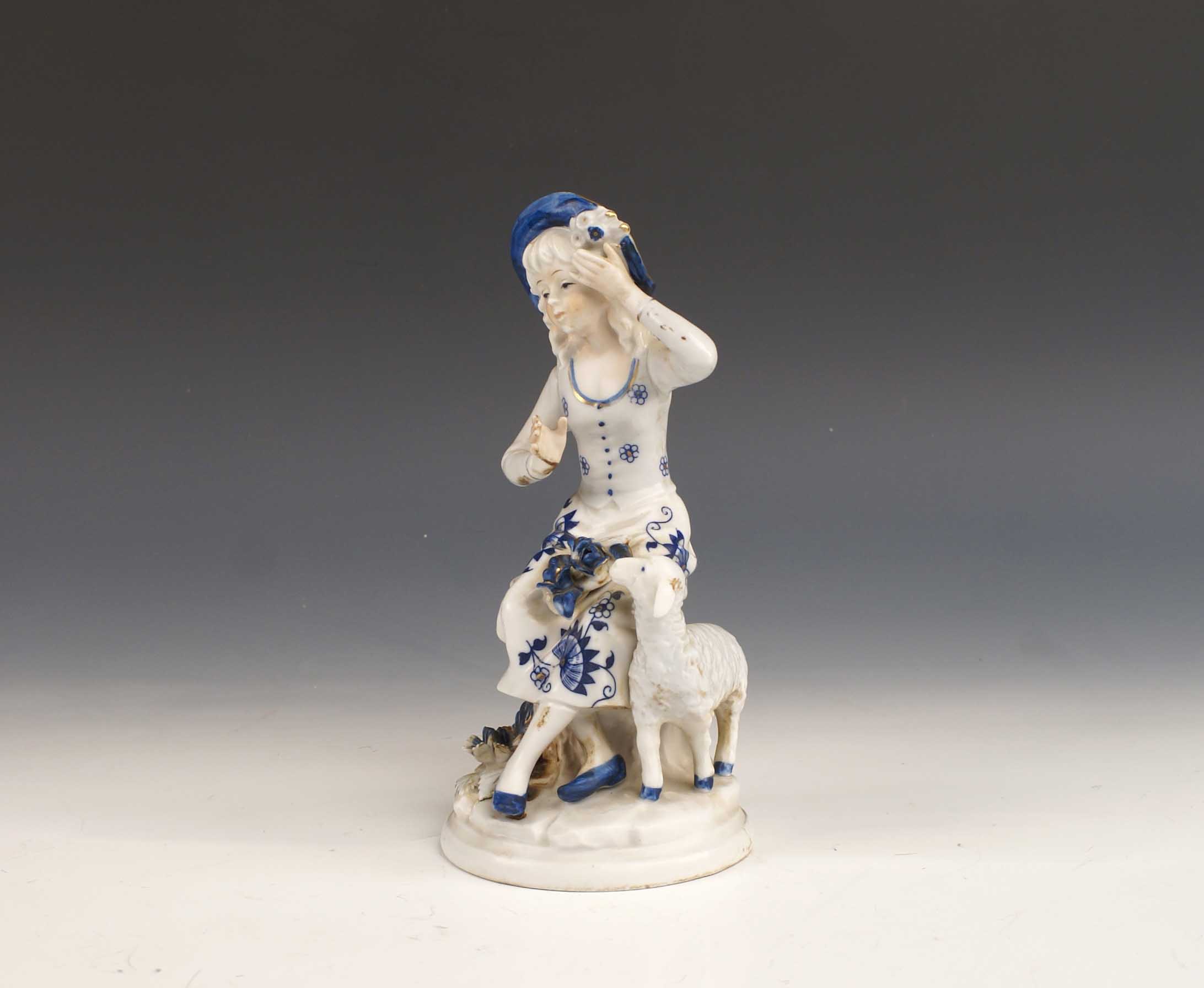 GRUPPO IN PORCELLANA vecchia manifattura Bianca e blu cobalto raffigurante una fanciulla con pecora H. 22 cm.