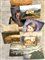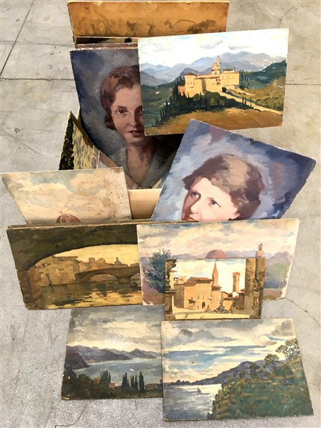 Cartone contenente numerosi dipinti ad olio su compensato, soggetti e dimension