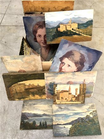 Cartone contenente numerosi dipinti ad olio su compensato, soggetti e dimensioni differenti (difetti)