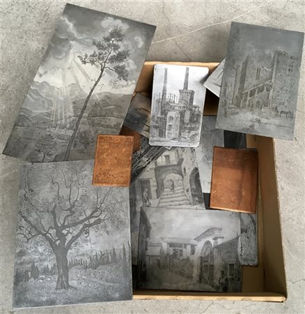 Cartone contenente numerosi cliché tipografici raffiguranti paesaggi, autori e