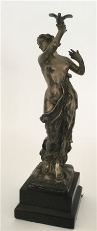Scultura in argento raffigurante donna con colomba (h. cm 24) Firmata al retro.