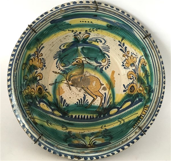 Bacile in terracotta smaltata in policromia a cervo in un paesaggio. Secolo XIX